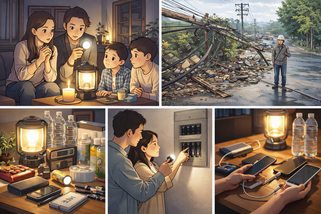 ここでは、停電の範囲確認→火災予防→生活を守る工夫→避難時の注意、という流れで整理します。「何から?」と迷ったときほど、手順通りに進めると落ち着けます。家族がいる場合は、同じ手順を共有しておくと、誰か一人に負担が集中しません。備えは道具だけでなく、手順を知っていること自体が立派な対策になります。